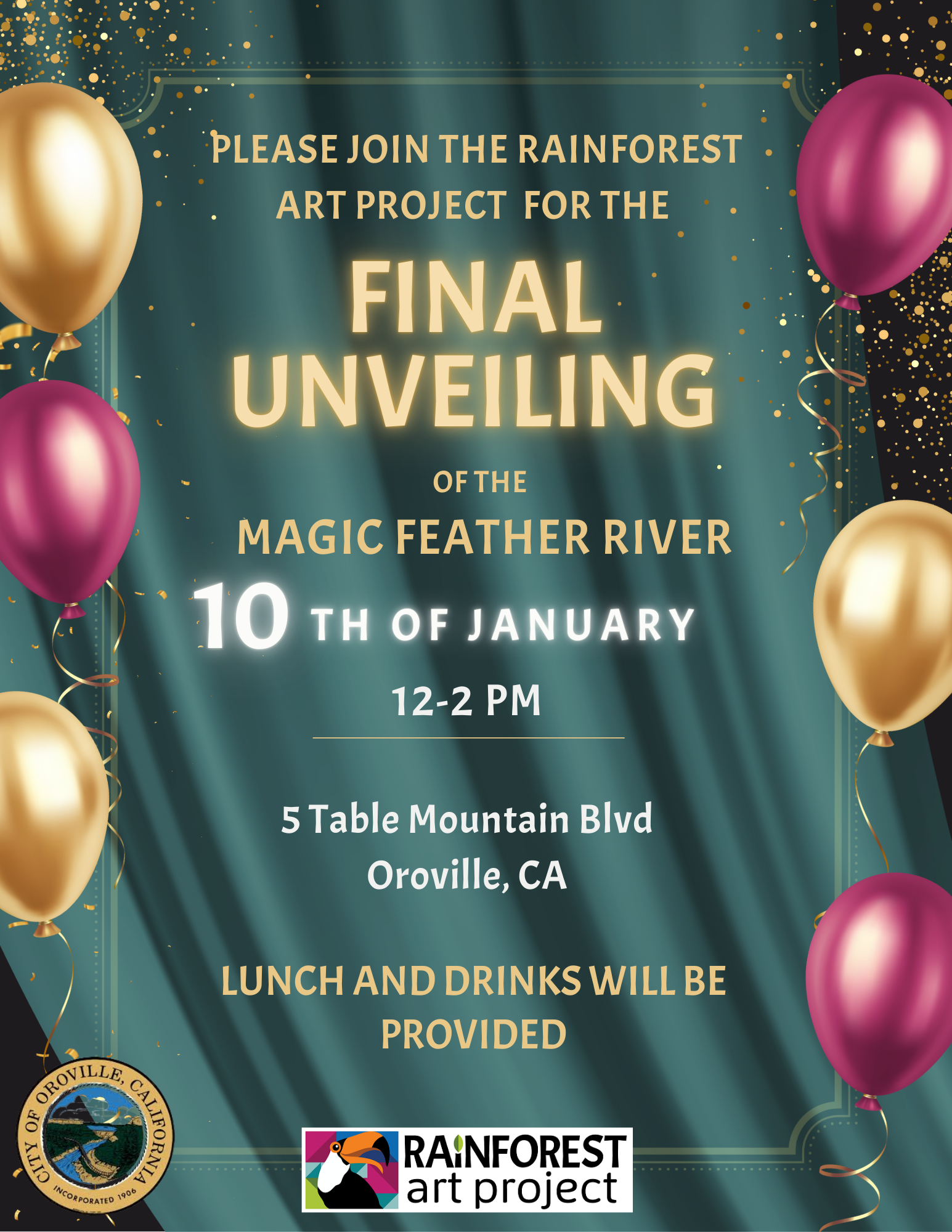 | 1/10/2026 | Join the Rainforest Art Project for the final unveiling of the Magic Feather River, a remarkable community-driven public art installation years in the making. Under the direction of Dan Evers, Leanna Lunsford, and the Artist of River Town, community members have come together to create 60 individual mural panels, put together one piece at a time. Each panel reflects a shared vision: to celebrate the landscapes, wildlife, and lifeforms that define our region and the Feather River corridor. This collaborative effort has been shaped by countless hands and creative voices over the years. Ten additional panels will be installed this week, bringing the project to completion. The final unveiling is a chance to celebrate the artists, volunteers, and community members who made this unique endeavor possible — and to experience the completed Magic Feather River as a unified work of art. 📅 Saturday, January 10 Lunch and drinks will be provided. All are welcome to attend and celebrate this extraordinary example of community creativity and collaboration. more info... |