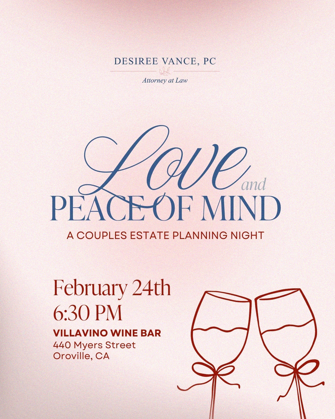 | 2/24/2026 | Join us for Love and Peace of Mind: A Couples Estate Planning Night, a relaxed and informative evening created especially for couples who want clarity, confidence, and peace of mind when it comes to planning their future. This educational event is designed to make estate planning approachable and easy to understand — no pressure, no legal jargon, just helpful guidance in a comfortable setting. What to expect: ๐ฅ Enjoy a complimentary glass of wine while you learn and connect in a welcoming atmosphere at Villa Vino Wine Bar. This event is ideal for: Please note: Come for the wine, stay for the peace of mind — because the strongest plans are made together. more info... |