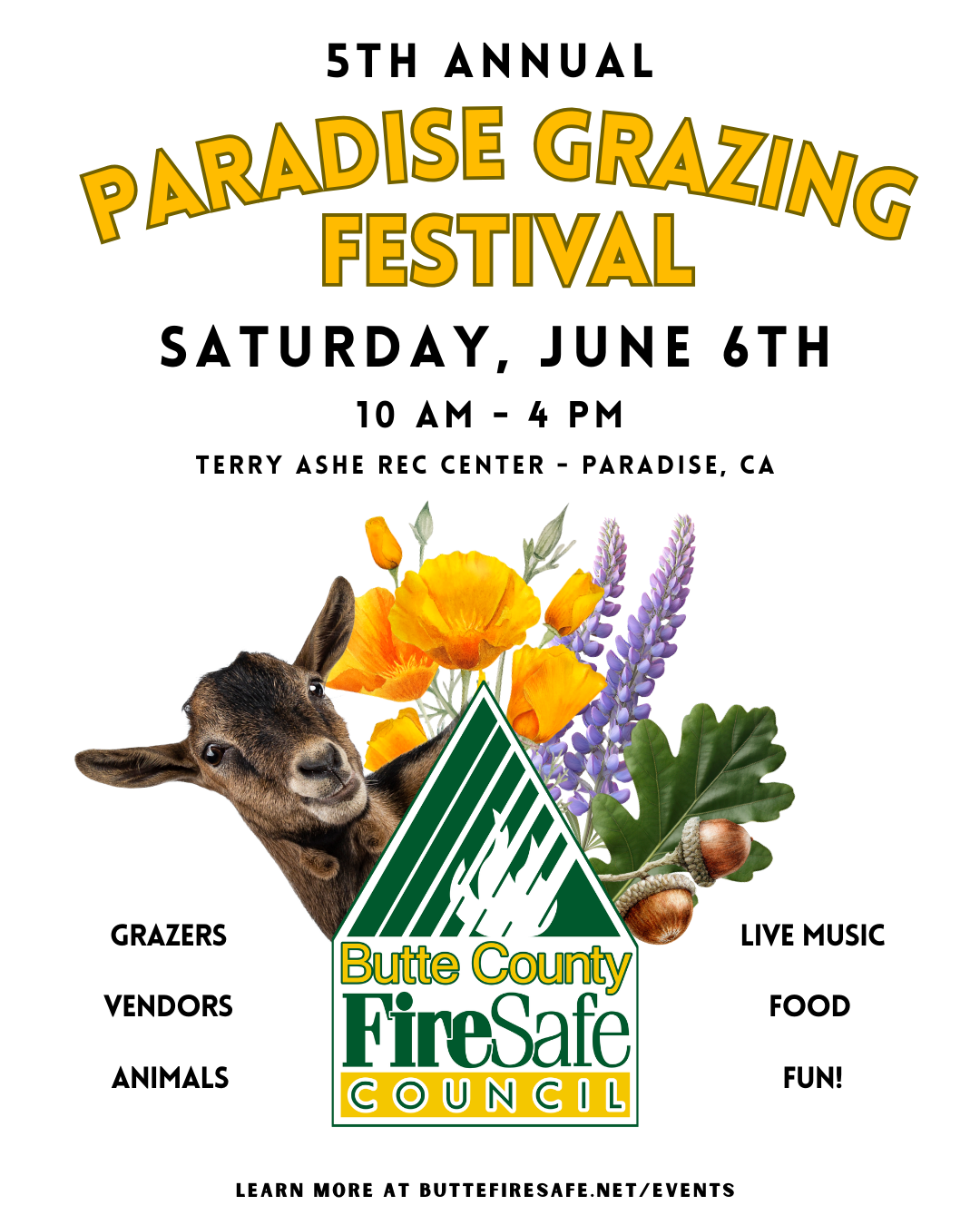 | 6/6/2026 | Bring the whole family for a FREE, fun-filled day exploring how targeted grazing reduces wildfire risk, restores healthy landscapes, and protects the places we call home. Meet local ranchers and land stewards, connect with community partners, watch live demonstrations, learn about grazing cooperatives, and enjoy delicious food, live music, local vendors, goat yoga, and hands-on activities for all ages. Together, we’re shining a light on local, land-based solutions that strengthen wildfire prevention efforts and build long-term community resilience across Butte County and beyond. Come be part of the movement. Celebrate stewardship. Support local solutions. We can’t wait to see you there! more info... |