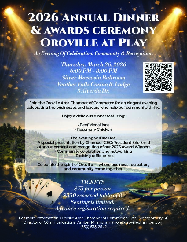 Join the Oroville Area Chamber of Commerce for our 2026 Annual Dinner & Awards Ceremony, themed “Oroville at Play.”