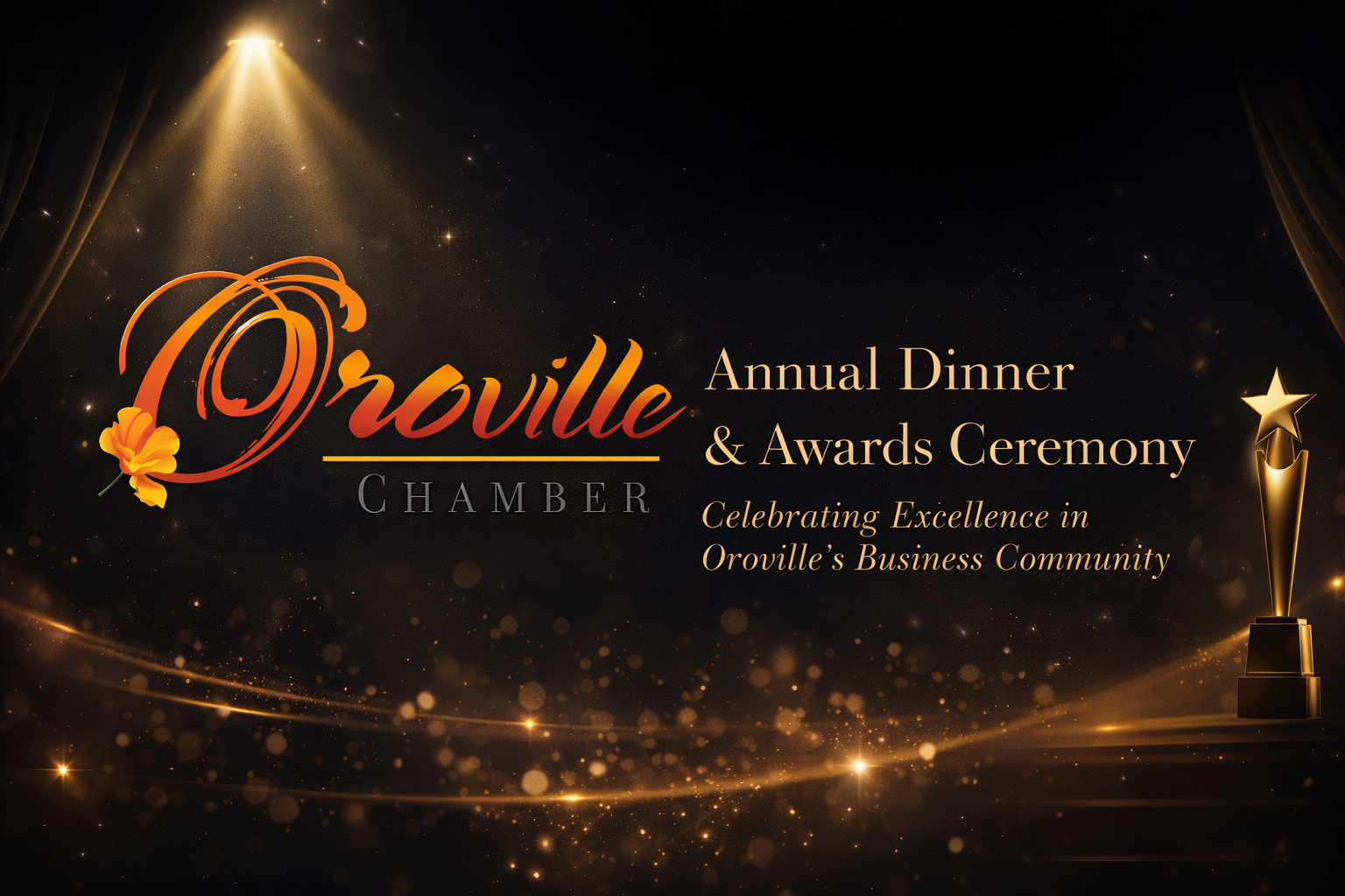 Join the Oroville Area Chamber of Commerce for our premier annual event—an elegant evening dedicated to celebrating the businesses, leaders, and organizations that drive Oroville’s economic vitality. The Annual Dinner & Awards Ceremony brings together business owners, community partners, and elected officials for a night of recognition, connection, and celebration.